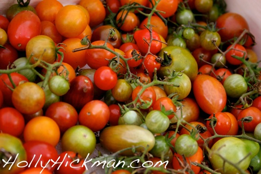 “These are the green zebra. This is the Cherokee Purple, kind of a dusky rose. Ooh! Yellow Pear. And then these kind start off pale but will blush into a beautiful mahogany on your counter. Look at the the heirlooms. Beautiful, no?”