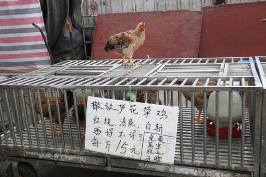 If you’re after hens or roosters, you can peruse the quality of the show bird on top of the cage before picking one out to be beheaded for your soup pot.