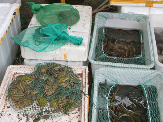 Fresh frogs, snakes, and eels are on display; make a purchase and they’ll be butchered for you to order. (The frogs are in the mesh bag so they don’t jump away, and the snakes are tied up in the green bag, thank goodness.)