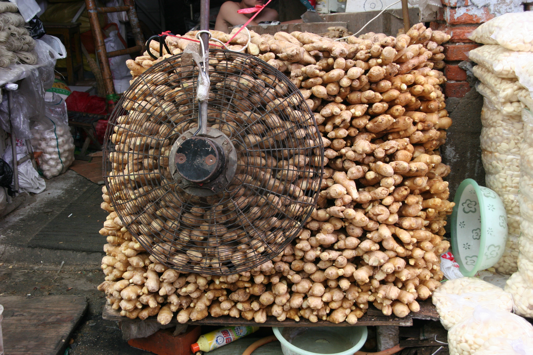 How about some spice and seasonings? Fresh ginger is available year round, and vendors place fans directly on piles of ginger to dry them out and keep them from molding in the humidity. You can see huge bags of peeled garlic cloves for sale too.