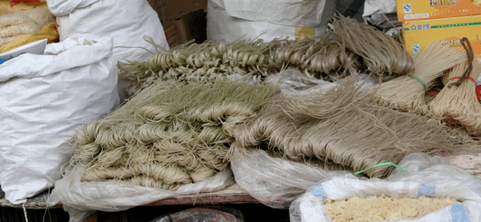 You can also find all sorts of noodles. A Shanghainese special is noodles made from rice and green beans, so some have a light green color.