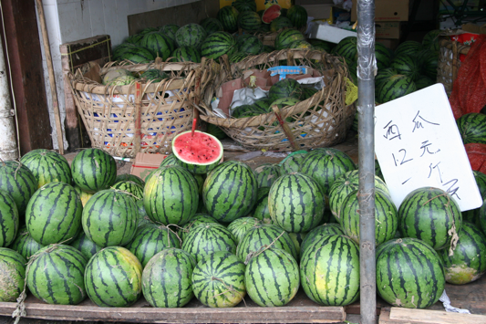 July in China means: watermelons! They are everywhere, and they are delicious. The Chinese watermelons are a round variety about the size of a volleyball. They are juicy and succulent and they sure taste great when it’s 100 degrees out.